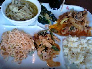 グリーンカレーやカオッパ、ビーフン、豚肉の辛味炒め、完全セルフサービス形式のタイラーメンをはじめタイの大衆屋台料理的なものが食べ放題。